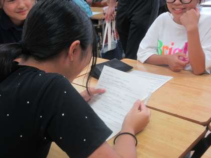 英語の自己紹介文を作ります。Hello,everyone.(皆さん、こんにちは)に始まって、自分の好きな食べ物や中学校で入りたい部活動などの自己紹介文を、4人の英語科の先生の助けを借りながら仕上げました。初めて会った他校の児童に英語で自己紹介した気分は、どうでしたか。