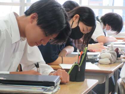 【写真・下】9年5組・数学(少人数)の授業の様子です。