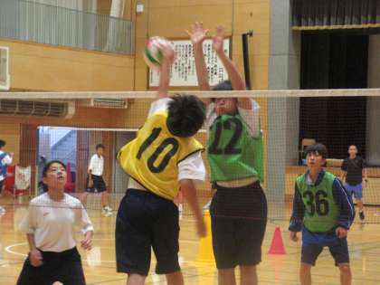 『バレーボール』に取り組んでいます。これまでもお伝えしていますが、この競技の面白みであるラリーを楽しむため「サーブは相手コートにふわっと投げ入れる」「レシーブはボールをキャッチしてよい」「パスを手投げで上げてよい」等のキャッチバレールールで行っています。