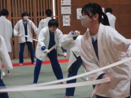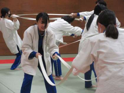 『柔道』に取り組んでいます。現行の学習指導要領で必修となっている武道に分類される種目です(9年生は選択)。武道には、剣道や相撲・空手道・合気道などがありますが、本校では柔道に取り組みます。