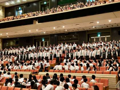 まず9年生の合唱発表です。9年生は昨年度後半から、できる範囲で『大地讃頌』の練習に取り組んできました。以前この曲は、9年生の課題曲として各クラス別々に歌っていましたが、学級増に伴い時間的な制約も出てきたため、今回から学年合唱として披露しました(写真・上)。