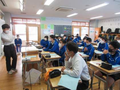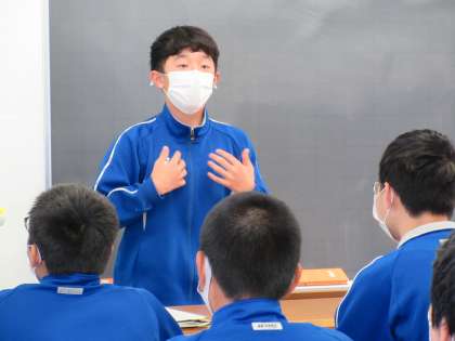 英語による自己表現活動(スピーチ)で、本日は発表会を行っていました。テーマは『将来の夢』です。一人ずつ前に出て発表し、採点は担当の先生、ALTの先生、そして、クラスメイト全員です。原稿を暗記していることはもちろん、声の大きさや発音、ジェスチュアなどが審査基準です。