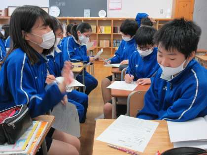 【写真・上】8年3・4組 英語(少人数)の授業の様子です。