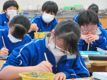 『絵文字』に取り組んでいました。すでに完成した人は、好きな文字のレタリングをしています。なんと58画の「ビャンビャン麺」の「びゃん」(変換できないので辞書で調べてください)を描いている人もいました。