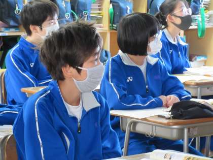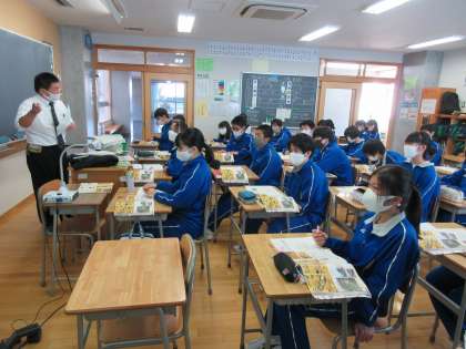 さらにその内部には大広間を設け、ふすまや屏風絵金箔を使った絵が描かれたりもしました。写真で生徒の皆さんが見ているのは、電子黒板に映し出された『唐獅子図屏風』(狩野永徳)です。