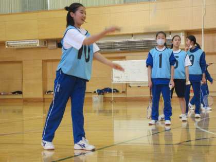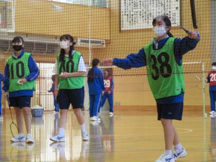 『バドミントン』に取り組んでいます。本日は、サービス(サーブ)の実技テストを行っていました。ロングとショート2種類のサーブを、ネットを挟んで先生のいる対角線側のコートに打ちます。