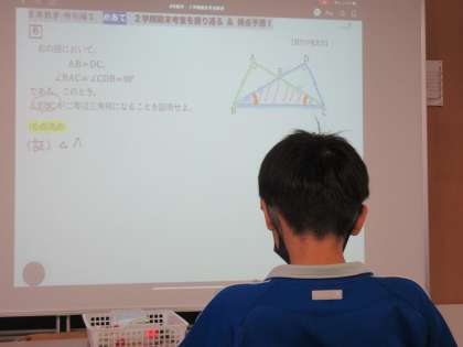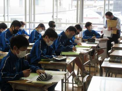 先週行われた期末考査の答案が返却され、早速「やり直し」に取り組んでいました。模範解答や詳しい解説を載せたプリントが配られ、それをもとに「解き直しレポート」を作成するという丁寧な取り組みです。