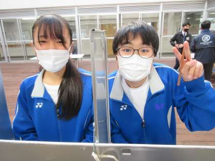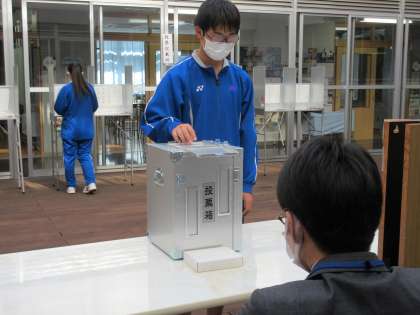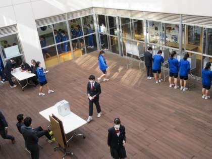 それらを比較し、誰に投票するか決めました。2クラス合同授業だったので、密を避けるため投票所はライトコート(校舎吹き抜け)に設けました。名簿対照係に生徒手帳を見せ、投票用紙交付係から用紙を受け取ります。