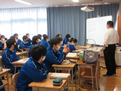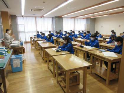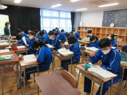 【写真・下】9年3・4組 英語(少人数)の授業の様子です。