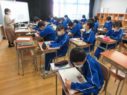 実際にこの後学習する英語落語の演目は『ドーナツこわい』。もうお分かりでしょうが、古典落語の『まんじゅうこわい』をアレンジしたものです。さて、中学生の皆さんに、噺(はなし)の「オチ」が分かるでしょうか。