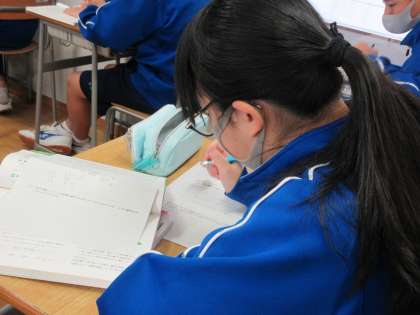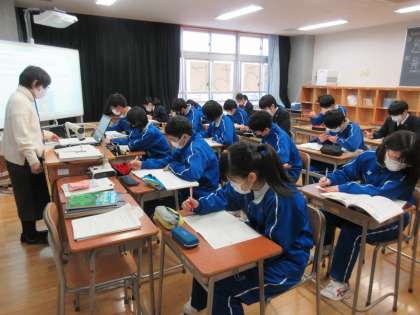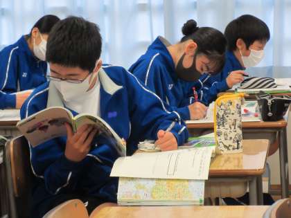 【写真・中】8年2組・社会(地理)の授業の様子です。