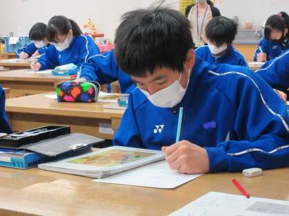 そのマス目を参照しながら、同じく16分割された用紙に描き写していました。下絵ができたら彩色も施すそうですが、こうした実技により名画の構図や色彩、ひいては画伯の感性やものの見方なども学ぶことができます。