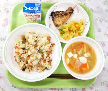 五目おこわ ぶりの照り焼き キャベツときゅうりの浅漬け 大根とじゃがいもの味噌汁 牛乳
