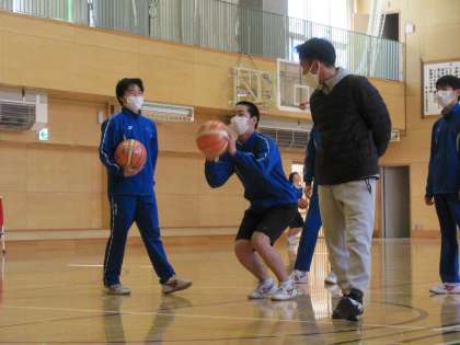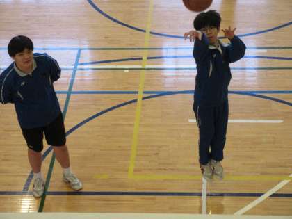 『バスケットボール』に取り組んでいます。本来この種目の授業のめあては【『入れる・かわす・運ぶ』の攻防を楽しむ】とすることが多いのですが、現在は、感染症予防の視点から身体接触を避けなければなりません。