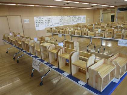 それに対し中学校の技術科では、実践的・体験的な活動を目的に実習や製作に取り組みます。そんな初めての実習が、国剤加工『木製棚』づくりでした。友達とも協力しながら完成させた作品が並んでいます。
