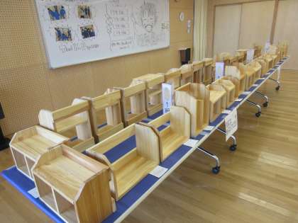 7年生・技術科で制作した『木製棚』の展示です(ランチルーム)。