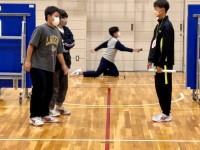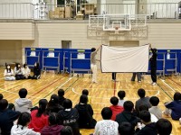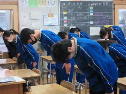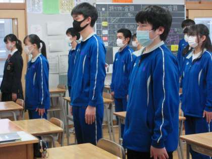 卒業式の意義や目的について説明を受け、過去の卒業式の録画を視聴して大まかな流れを確認しました。最後には、実際に「気をつけ、礼」のタイミングを練習してみました(写真・中・下)。時間や参列者に制約の多い卒業式になりますが、心のこもった式にしましょう。