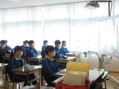 本来であれば、体育館等で学年集会を開いて行いますが、緊急事態宣言下ということで学年単位の集会もできるだけ控えています。そのため別室から先生方が、リモートでガイダンスを行いました(写真・上)。