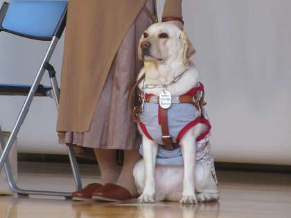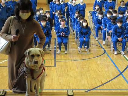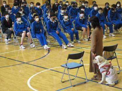 また、8年生の道徳では、教科書の『最後のパートナー』という読み物を使用した授業も行っています。引退した盲導犬を引き取るボランティアの話だったので、ジェシーちゃんを見て思い出した人もいるかと思います。