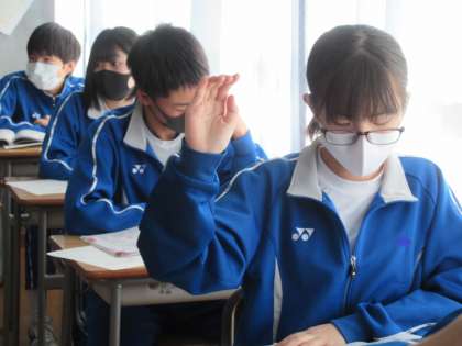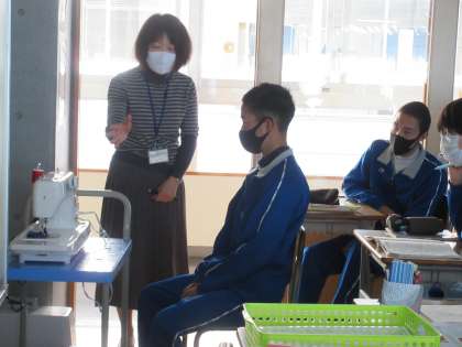 授業のめあては【ミシンの安全な使い方を確認する】です。本来はミシンを使用してトートバッグ製作の実習を行うところでしたが、今年度は感染症対策により「教室でできる実習」としてエコバッグを手縫いで作りました。