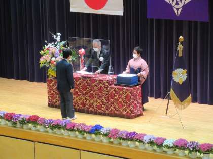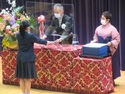 コロナ感染対策として、演台には特注のアクリル板を設けました。下の部分に証書が手渡せるだけのスペースが空いています。アクリル板越しでしたが、卒業生一人ひとりが私の目を見て受け取ってくれていました。
