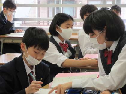わからない問題は、先生が個別に対応されています。一方、区のガイドラインは緊急事態宣言下における近距離での話し合い活動を禁じているため、なるべく声を出さず筆談等で友達どうし教え合う光景も見られました。