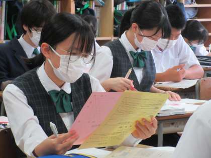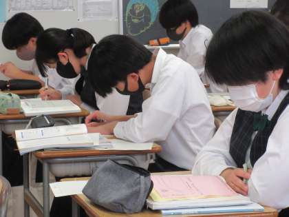 課題作文『条件に応じて説得力のある文章を書く』に取り組んでいます。提示された文章のほか、図や表などの資料の内容を読み取り、自分の考えを200字程度の作文にまとめます。