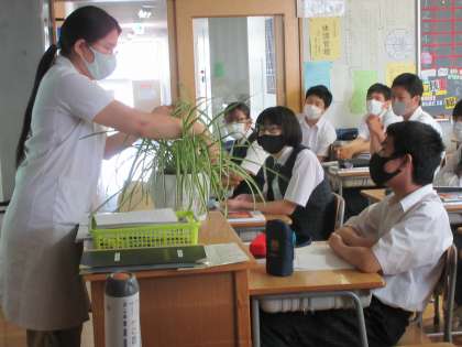 先生が育てていらっしゃるオリヅルランについて、その殖(ふ)え方を説明されていました(写真・上)。オリヅルランは、ランナーと呼ばれる茎の先端にできた子株によって殖やすことができます。