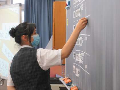 『6つの食品群』の学習です。身近な食品名を黒板の分類表に貼り付けています。「いちご」は第4群(その他の野菜・果物など)ですが、「いちごジャム」は第5群(穀類・砂糖など)であることなど、勉強になりました。