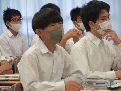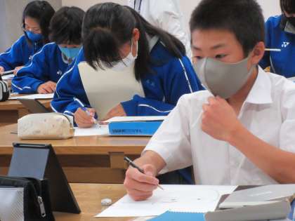【写真・下】9年4組・社会(歴史)の授業の様子です。