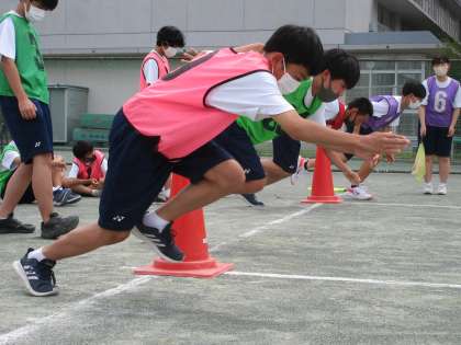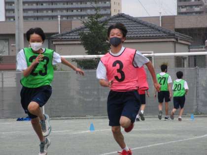 新体力テスト(スポーツテスト)の種目の一つ『50m走』の計測を行っていました。走る際にはマスクを外してもかまいませんが、その際には発話厳禁(呼吸が整ったらマスク着用)の指示が出ています。