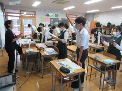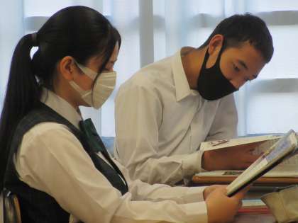『 A Mother's Lullaby(母の子守歌)』の学習です。擬人化された広島の街路樹が見た光景、聴いた歌について描いた読み物です。全文を読んだ後で、先生が内容に関するいくつかの質問をされました。