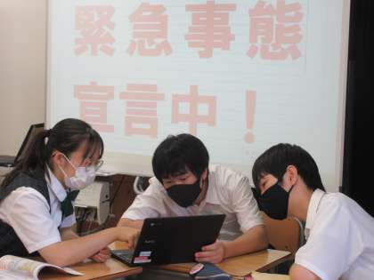 一方で、こうした作業は楽しく、つい会話も弾んでしまいがちです。そこで、このグループでは(写真・上)のように大きく電子黒板に【緊急事態宣言中】と映し出し、緊張感を持たせていました。先生からも時折「近づきすぎですよ」「声が大きくなっていますよ」等の注意が与えられていました。