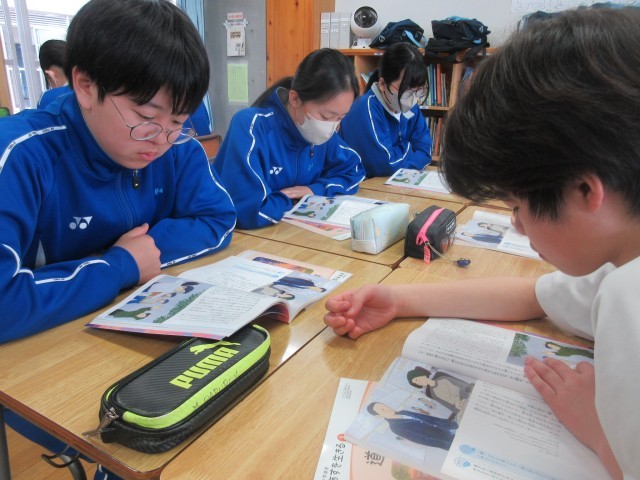 「公正・公平・社会正義」をテーマに、教科書の『命の大切さ』という読み物を使用しています。全国中学生人権作文コンテストの入選作品なので、自分たちと同じ中学生の実体験が綴られています。