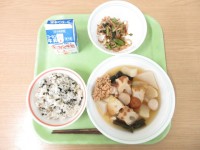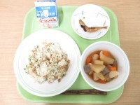 【今日の給食】・かつお飯・ぐる煮・さつま汁・牛乳 今日は、高知県の郷土料理で...