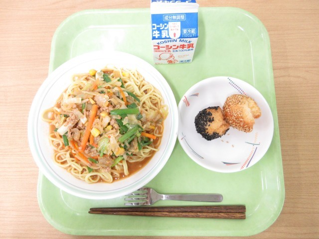 開口笑とは中国の縁起の良いお菓子の1つです。小麦粉と卵などを混ぜてお団子にし、ごまをまぶして揚げて作ります。漢字で「口を開けて笑う」と書きますが、揚げているときに自然に生地が割れて、口を開けたような形になるため、この名前がつけられました。剥がれてしまったものもありますが、白ごまと黒ごまの2種類を作りました。残さず食べましょう!