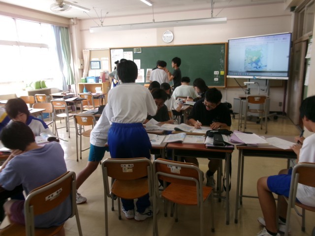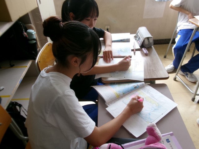7年生社会の授業 公開日 2025/10/03 更新日 2025/10/03 7年生 10月3日、7年生社会の授業の様子です。今日は、地理でアジアについて学習していました。ワークシートを使用して、グループで相談しながら進めていました。グループは、2人1組・3人1組・5人1組などいろいろでした。