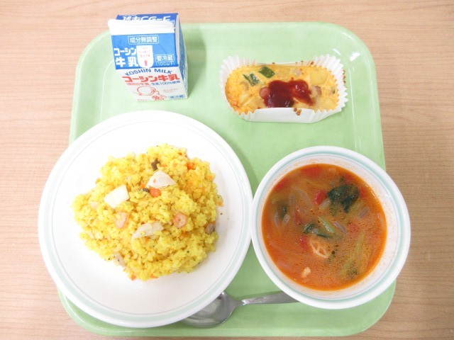 パエリアはスペインのバレンシア地方の郷土料理で、バレンシアの猟師が獲物を米と一緒に煮込んだのが始まりといわれています。パエジェラと呼ばれる専用のパエリア鍋で調理する米料理で、たっぷりの具を炒めて、米と水・サフランを加えて炊き上げます。パエリアはもともと「フライパン」を意味する言葉ですが、現在では料理の名称として使われています。今日は給食風にアレンジをして、ターメリックとスープでご飯を炊き上げました。美味しく食べてくださいね!