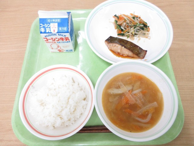 10月の給食目標は「主食・主菜・副菜を意識して食事をしよう」です。今日の給食の場合、主食がごはん、主菜が魚、副菜がほうれん草ともやしのごまあえです。主食・主菜・副菜がそろうと、バランスの良い食事がとりやすくなります。意識して食事をしてみましょう。