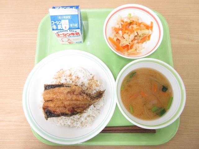 鰯は、海面近くを群で泳ぐ魚で、日本で古くから親しまれてきました。鰯には、歯や骨のもととなるカルシウムと、そのカルシウムの吸収を助たけるビタミンDが含まれており、成長期にたくさん食べておきたい魚の一つです。今日は、鰯の栄養をたくさんとれるように蒲焼きにしました。残さず食べましょう!