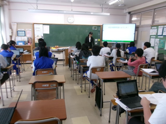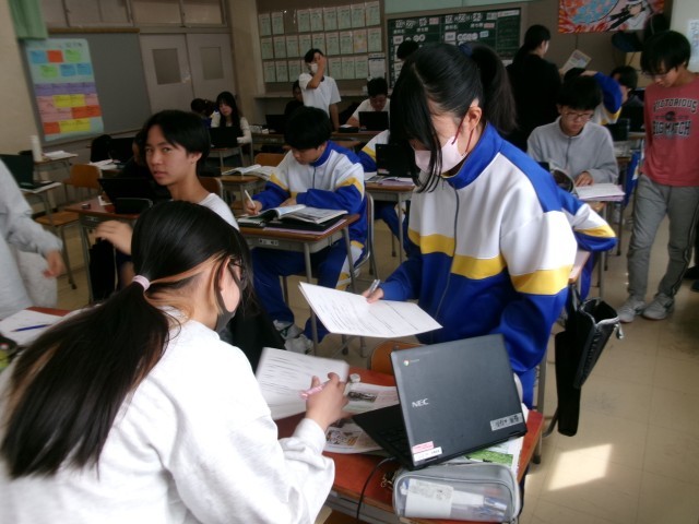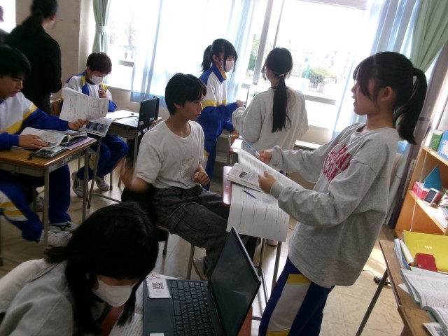 8年生社会の授業 公開日 2025/10/23 更新日 2025/10/23 8年生 10月23日、8年生社会の授業の様子です。今日は中部地方について学習していました。生徒たちは全員「板五地理研究会」の研究員という設定で、中部地方についていろいろと調べていました。授業の形式は自己選択型学習で、自分が調べたい地域を選び調べ方も自分で選んでいました。何人もの友達と意見交換をしている生徒もいました。