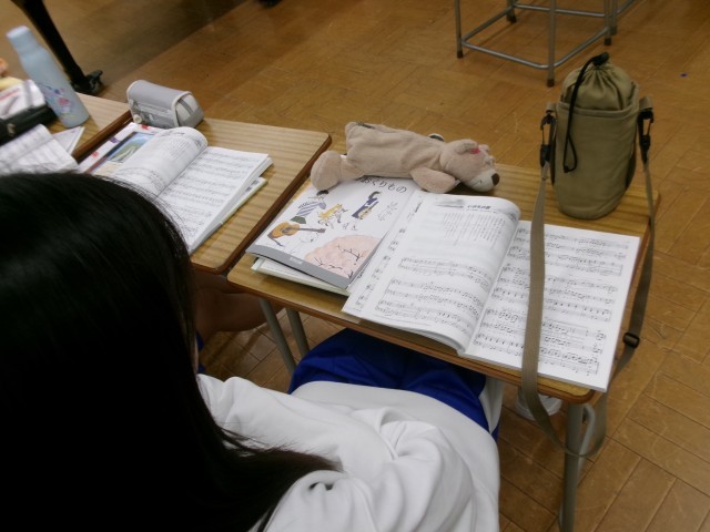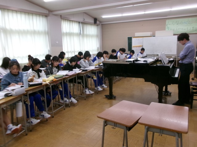 7年生音楽の授業 公開日 2025/10/24 更新日 2025/10/24 7年生 10月24日、7年生音楽の授業の様子です。今日は、学芸発表会で全校合唱として歌う「いのちの歌」の模範演奏を聞いていました。7年生は今日からこの歌の練習を始めますが、先輩の8・9年生からは「自分たちについてこい!」と力強い言葉を受け取っているようです。