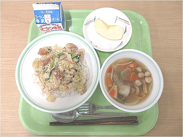 今日は宮城県の郷土料理の献立です。仙台麩は、お麩を油で揚げた「あぶら麩」のことで、宮城県の名物です。卵でとじた「油麩(丼」は人気があるメニューだそうです。おくずがけは、お彼岸やお盆の代表的な精進料理です。数種類の野菜や油揚げ、豆麩などをだしで煮込み、麺を加えて、くず粉でとろみをつけた具だくさんの汁物です。宮城県の郷土料理を味わって食べてください☆