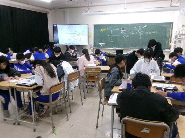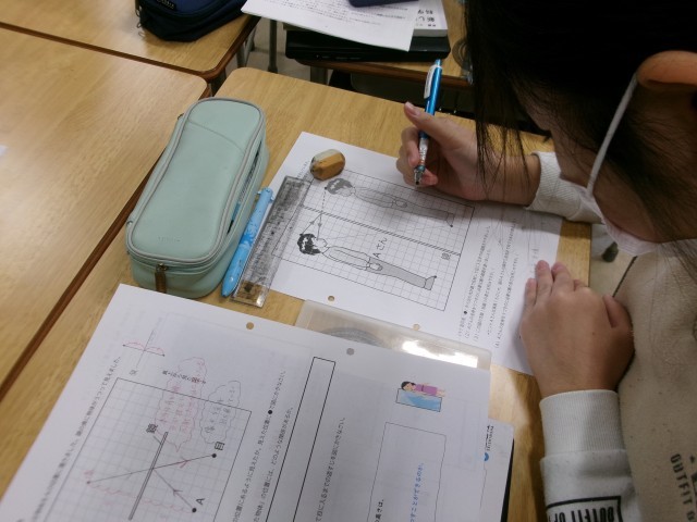 立っている人の姿を鏡に映した場合、必要な鏡の大きさを作図で求めていました。