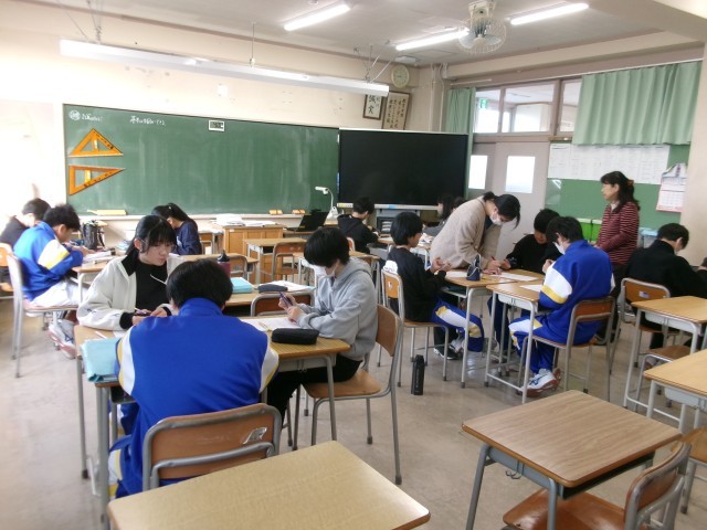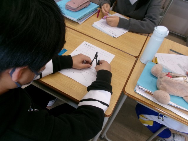 7年生数学の授業 公開日 2025/12/09 更新日 2025/12/09 7年生 12月9日、7年生数学の授業の様子です。今日は、図形の学習をしていました。二等分線の作図や図形の移動を行っていました。