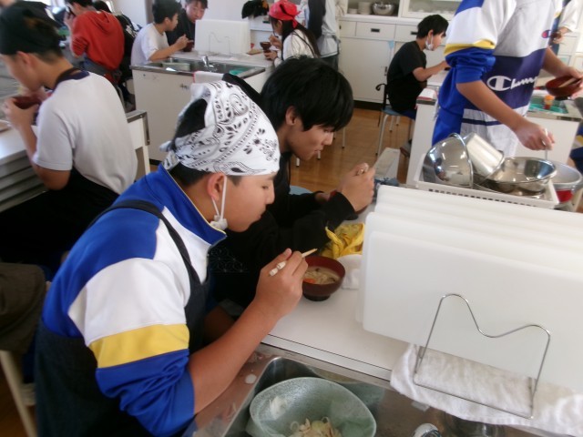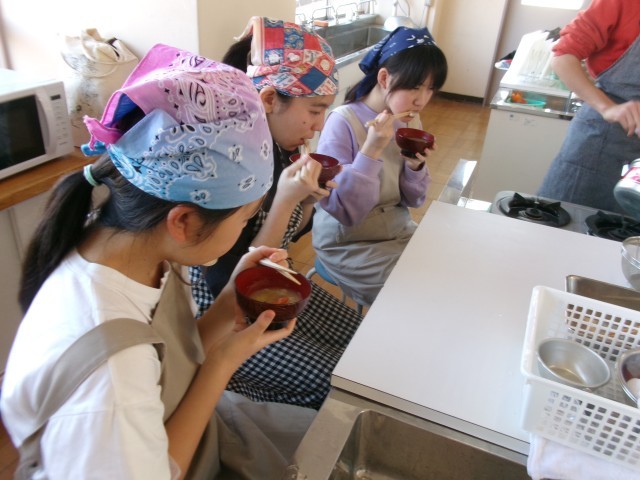 豚汁ができあがり、皆で試食をしていました。