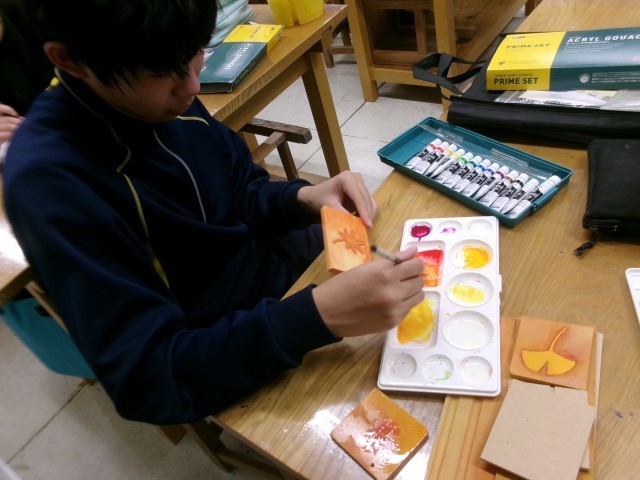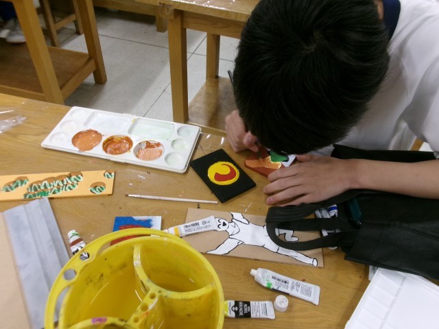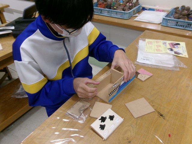 アクリル絵の具で色を付けている生徒、組み立てに入っている生徒など進度は様々ですが、真剣に楽しそうに作業していました。