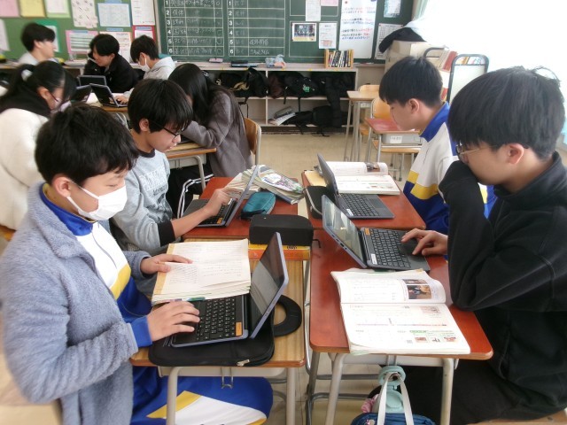8年生国語の授業 公開日 2026/01/15 更新日 2026/01/15 8年生 1月15日、8年生国語の授業の様子です。今日は、平家物語について、グループの友達と意見交換をしていました。中には、身振り手振りを交えながら説明している生徒もいました。