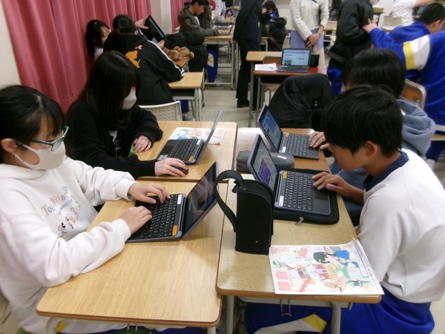 8年生校外学習振り返り 公開日 2026/02/02 更新日 2026/02/02 8年生 2月2日、8年生校外学習の振り返りの様子です。先週の1月30日に実施した校外学習のまとめとして、動画を作成していました。動画編集用のアプリを使って、上手に編集していました。出来上がりが楽しみです。