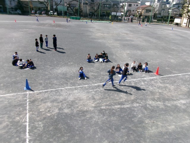 走るグループと記録を付けるグループに分かれて、交代でタイムを測っていました。